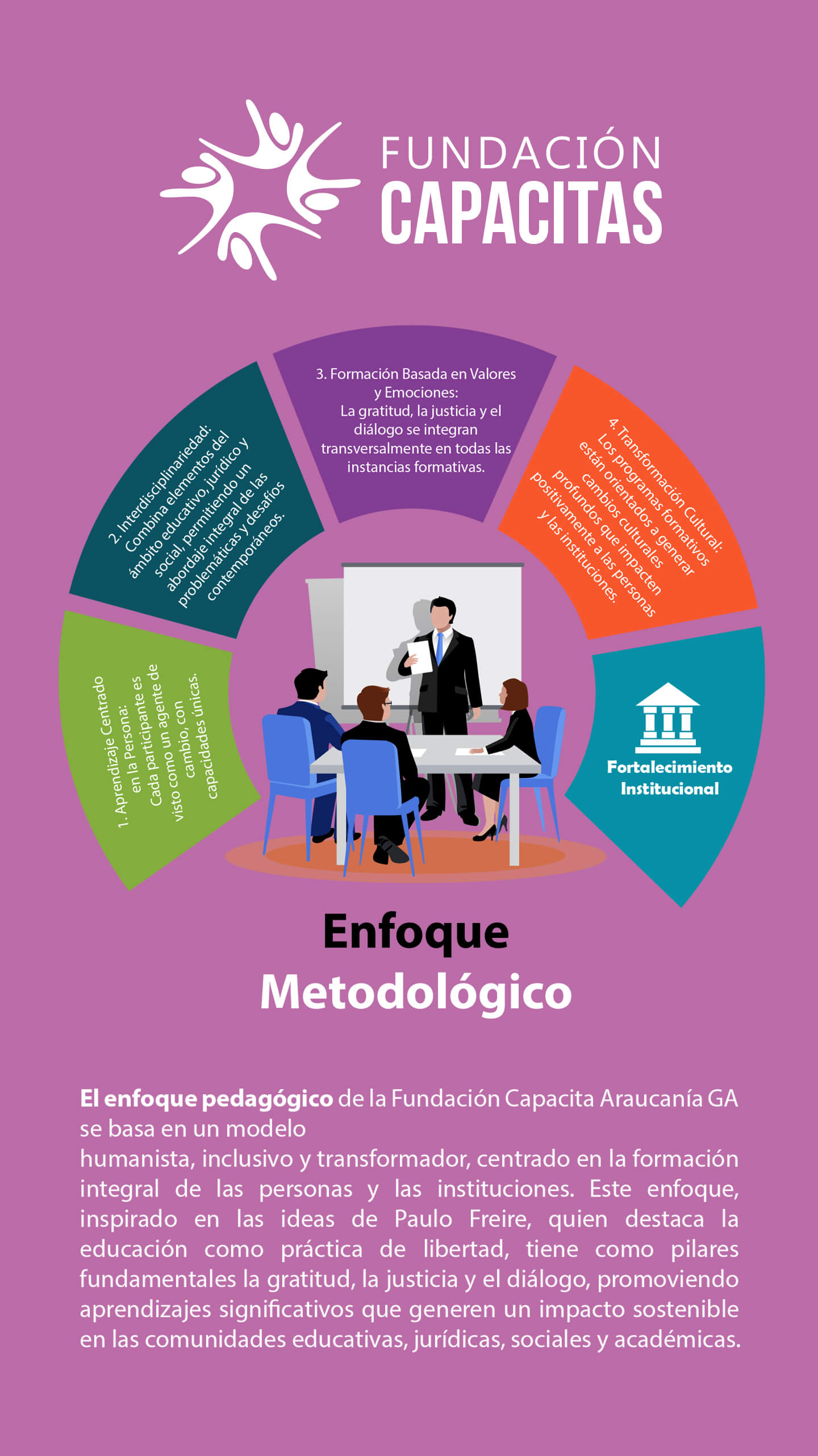Este enfoque y metodología, fundamentados en autores clave como Freire, Fullan, Sen, Nussbaum, Kolb, Vygotsky, Barrows y Hattie, aseguran que la Fundación Capacita Araucanía GA cumpla con su misión de ser un agente de cambio en la formación y fortalecimiento de comunidades más justas, cohesionadas y dialogantes.